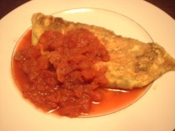 オムレツに添えたトマトソースは、カットトマト缶のトマトを容器に移してレンジで加熱し、軽く塩コショウしただけ。
