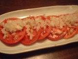 トマトはスライスして、みじん切りにした玉ねぎを散らして。ドレッシング等は各自好みのものを。ちなみに私は、オリーブオイル&岩塩で。