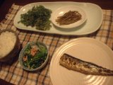 家庭菜園そばから、育ってしまったよもぎの上のほうをちょっとずつつまみ採り、そしてふき、たんぽぽの花、家庭菜園から小松菜を摘んできて今夜の食卓に。