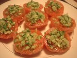 3 トマト2枚を1組にして、クリームチーズをはさむ。この上に2をのせて完成。