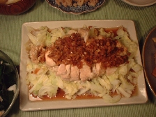 このレシピでは、鶏肉とキャベツはゆでただけです。