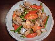 炒め物にもトマトはよくあいます。あさりを使うときは塩水につけて砂をはかせてから調理します。