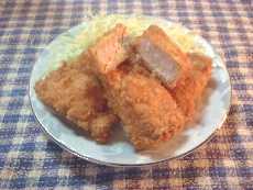 2 1の鮭にマスタードをまんべんなく塗り、小麦粉、溶き卵、パン粉の衣をつけて、きつね色に揚げる